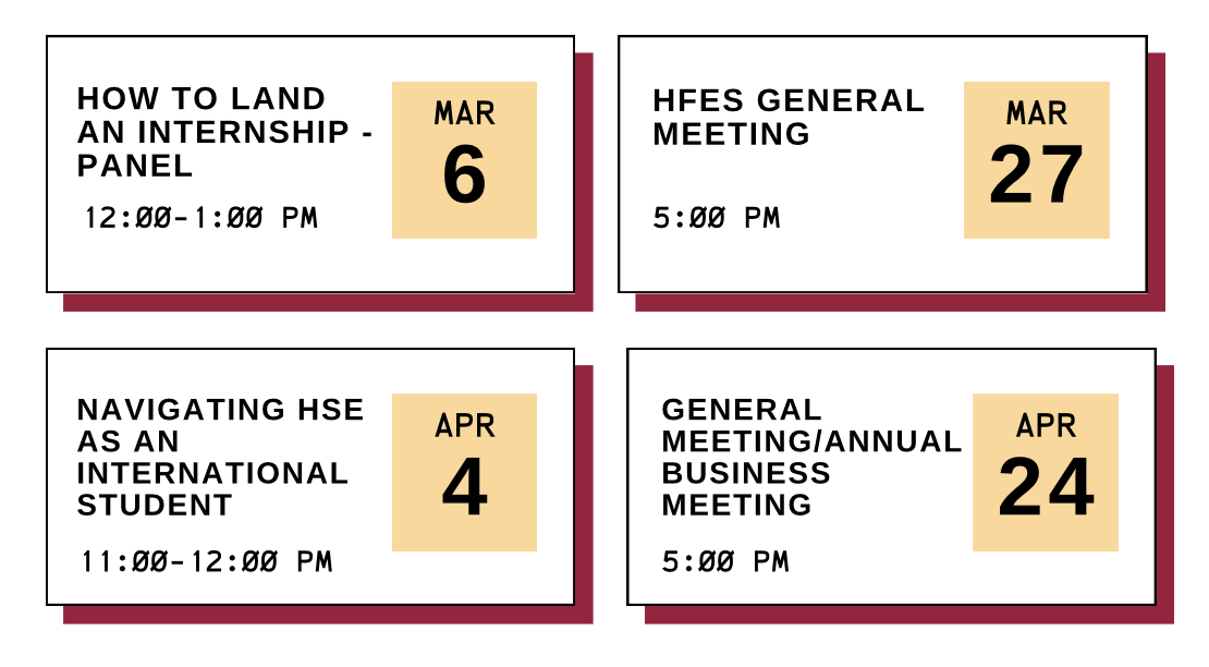 Spring is in full swing, and so is recruiting season! This month, we have exciting events to help you connect, learn, and grow in the field of human factors. Whether you're looking for an internship, networking opportunities, or ways to get more involved, we've got something for you.
